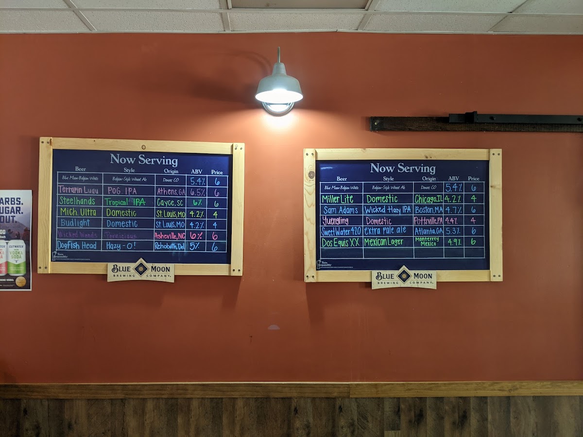 Bud Light / Michelob Ultra / Miller Lite / Coors Light / Yuengling / Blue Moon / Dos Equis / Sweetwater 420 / Steel Hands Rotating / Goose Island IPA / Sam Adams Seasonal / Truly Hard Seltzer